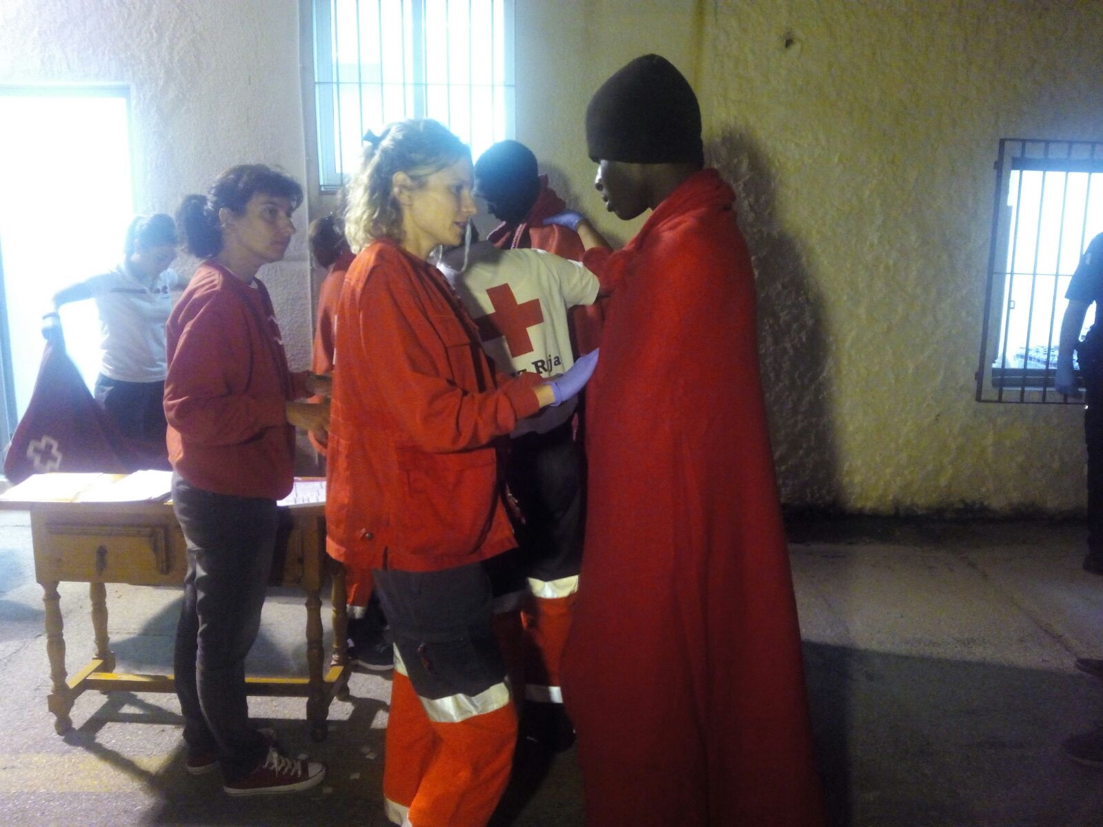 Una voluntaria de Cruz Roja atiende a uno de los inmigrantes esta noche. p.feixas